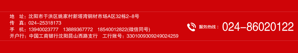 地址:沈陽市于洪區姚家村新塔灣鋼材市場A區32棟2-8號 開戶行:中國工商銀行沈陽昆山西路支行 工行賬號:3301009309249024259